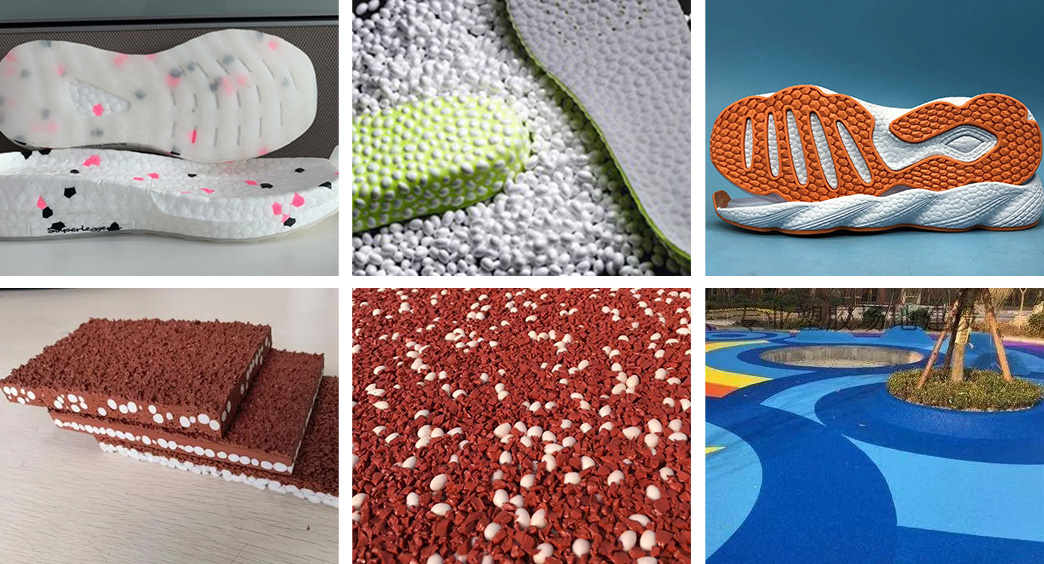 CO2发泡技术生产出来的E-TPE发泡颗粒以及EVA颗粒在各种运动鞋鞋底和鞋中底广泛应用,比以往传统技术生产出来的发泡颗粒重量轻,弹性好,缓冲减震效果好,这种产品生产出来的鞋底被业界形象的称为爆米花鞋底。